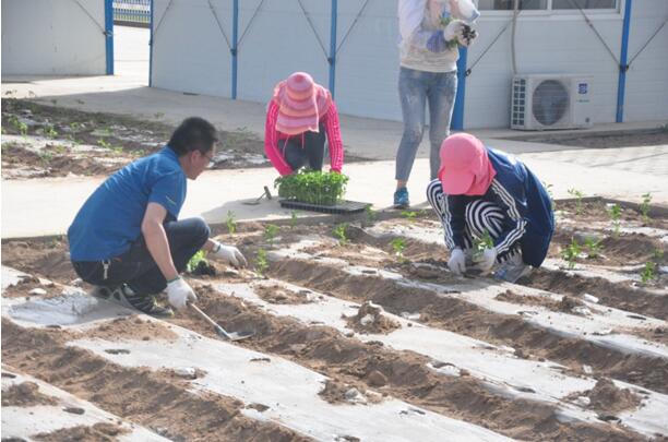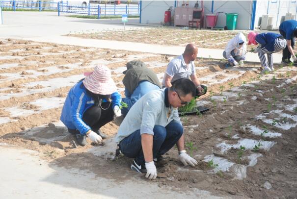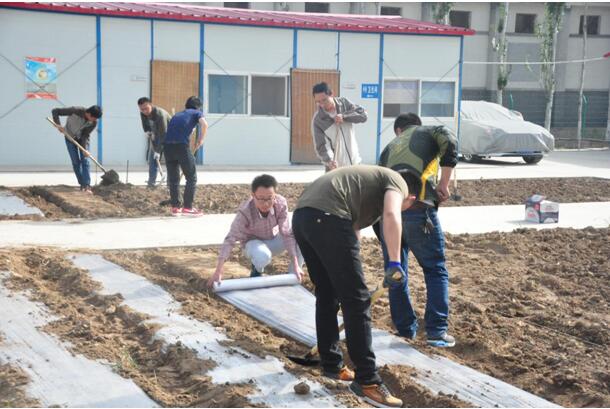 當(dāng)天上午葉盛黃河橋80、90后成員積極投身勞動中,對菜地進(jìn)行整平、打梁、壓膜,現(xiàn)場勞動氛圍異常熱鬧,幾位沒有干過農(nóng)活的小伙子們,也忙得不亦樂乎。下午3時(shí),公司機(jī)關(guān)人員與項(xiàng)目人員頭頂烈日、齊心協(xié)作種下百余顆番茄、黃瓜、辣椒、 茄子等植物。一整天辛苦而又快樂的勞動中,大家沒有怨言,相互配合,所有的菜地都整平完畢,種滿秧苗,大家臉上都露出了快樂、幸福的微笑。