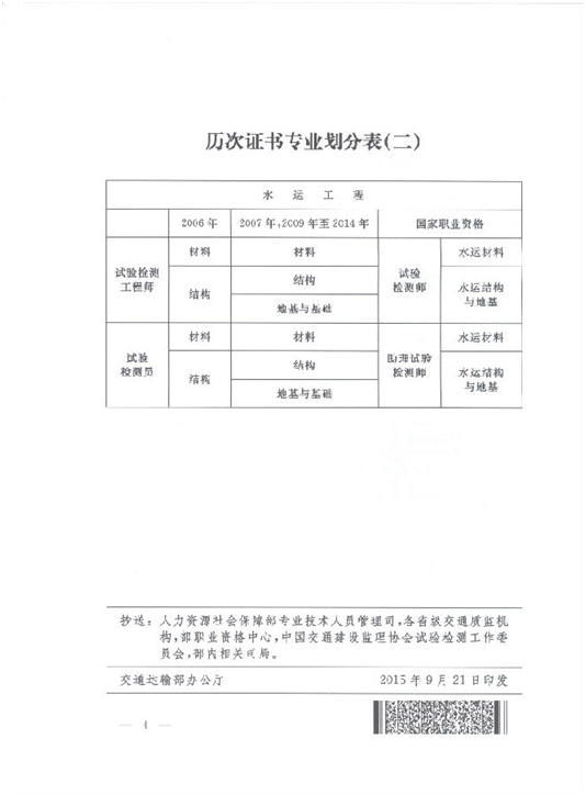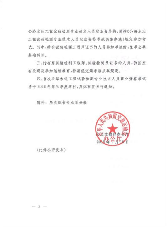 交通運(yùn)輸部辦公廳關(guān)于公路水運(yùn)工程試驗(yàn)檢測人員職業(yè)資格有關(guān)事項(xiàng)的通知