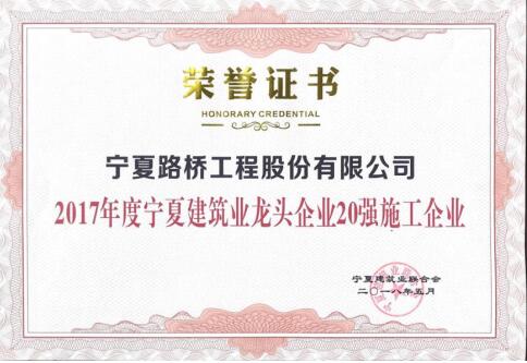 根據(jù)寧夏建筑業(yè)聯(lián)合會《關(guān)于開展2017年度寧夏建筑業(yè)龍頭企業(yè)20強(qiáng)評價(jià)工作的通知>》(寧建聯(lián)(市場)字〔2017〕54號)的規(guī)定,公司積極參與申報(bào)工作,經(jīng)各市建筑業(yè)協(xié)會(聯(lián)合會)和相關(guān)部門推薦,聯(lián)合會秘書處初審、測算,自治區(qū)住房和城鄉(xiāng)建設(shè)廳建管處、自治區(qū)建設(shè)工程質(zhì)量安全監(jiān)督總站會審,寧夏建筑業(yè)聯(lián)合會三屆八次會長辦公會審議通過,聯(lián)合會網(wǎng)站公示,寧夏路橋工程股份有限公司以綜合評分第一名的成績榮獲“2017年度寧夏建筑業(yè)龍頭企業(yè)20強(qiáng)施工企業(yè)”榮譽(yù)稱號。