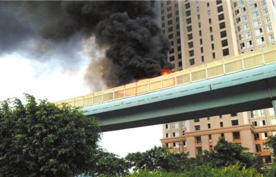 高架路很多公交車首尾相連,滯留在蔡塘站附近,大批乘客從車上涌出,向地面疏散。警車、120急救車、消防車不停來往。在距離地面約10米高的快速公交道上,公交車已被燒得只剩下車架,一側(cè)的擋板燒了大約9米。