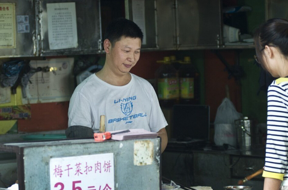 2009年剛開業(yè)的時候,每天門前排隊都會排起長隊,生意最好的時候,一天要做1600個餅。尤其到了放學時間,不少同學排隊半個多小時,就為了吃個餅。圖為肉餅店老板邵建華。