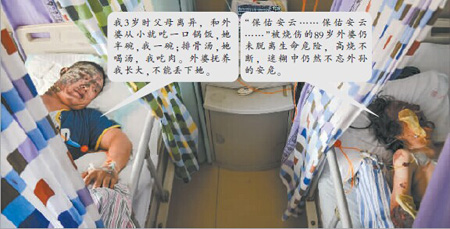 昨天,在重慶市第九人民醫(yī)院燒傷科,全身40%燒傷面積的鄧良珍處于昏迷狀態(tài),隨時都有生命危險。鄧良珍旁邊病床上的同樣被燒傷的李安云,費力地轉過身,看著外婆,眼淚流了下來。